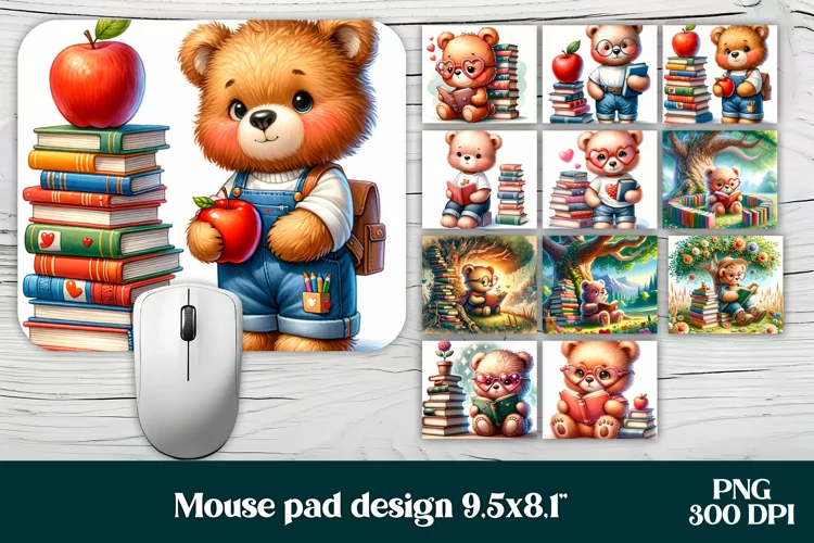 Cute bear mouse pad sublimation design, books animal sublimation design, animal mousepad sublimation.