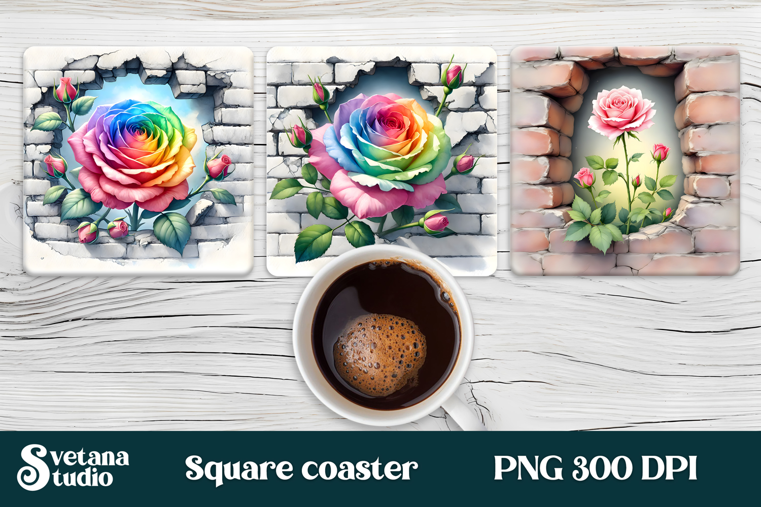 Vintage Rose Flower Square Coaster Sublimation Design – Floral Coaster PNG, Flower in Wall Sublimation Design