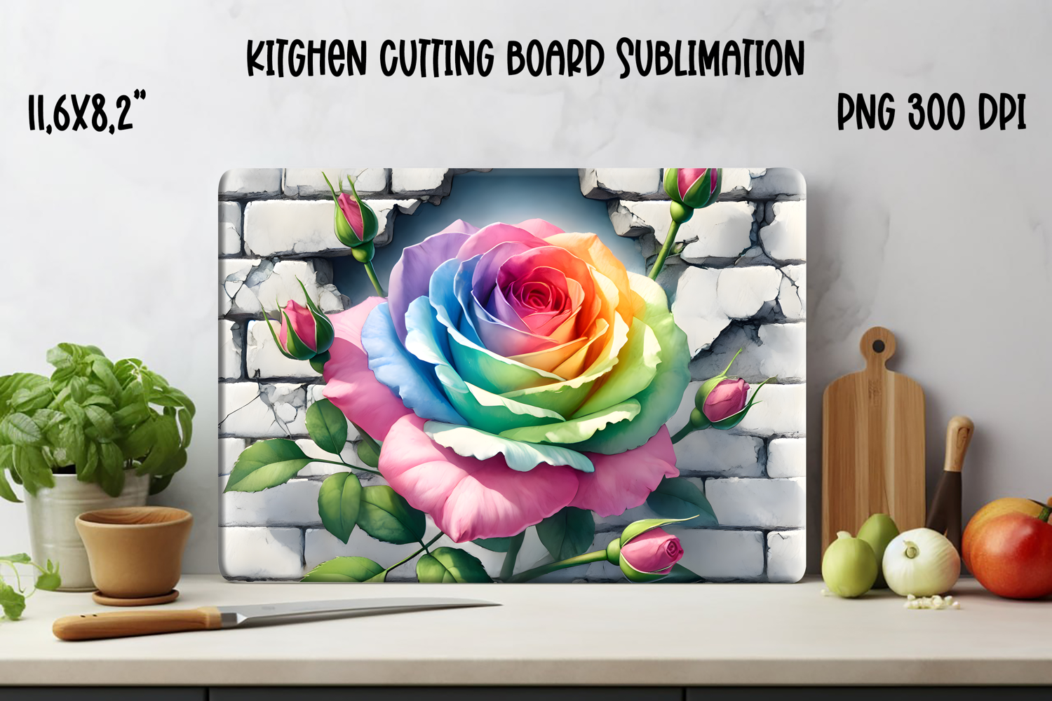 Use this vintage-style rose in wall sublimation design to create elegant cutting boards for yourself or as unique gifts. Perfect for floral lovers, romantic kitchen decor, or adding a timeless touch to your product line.