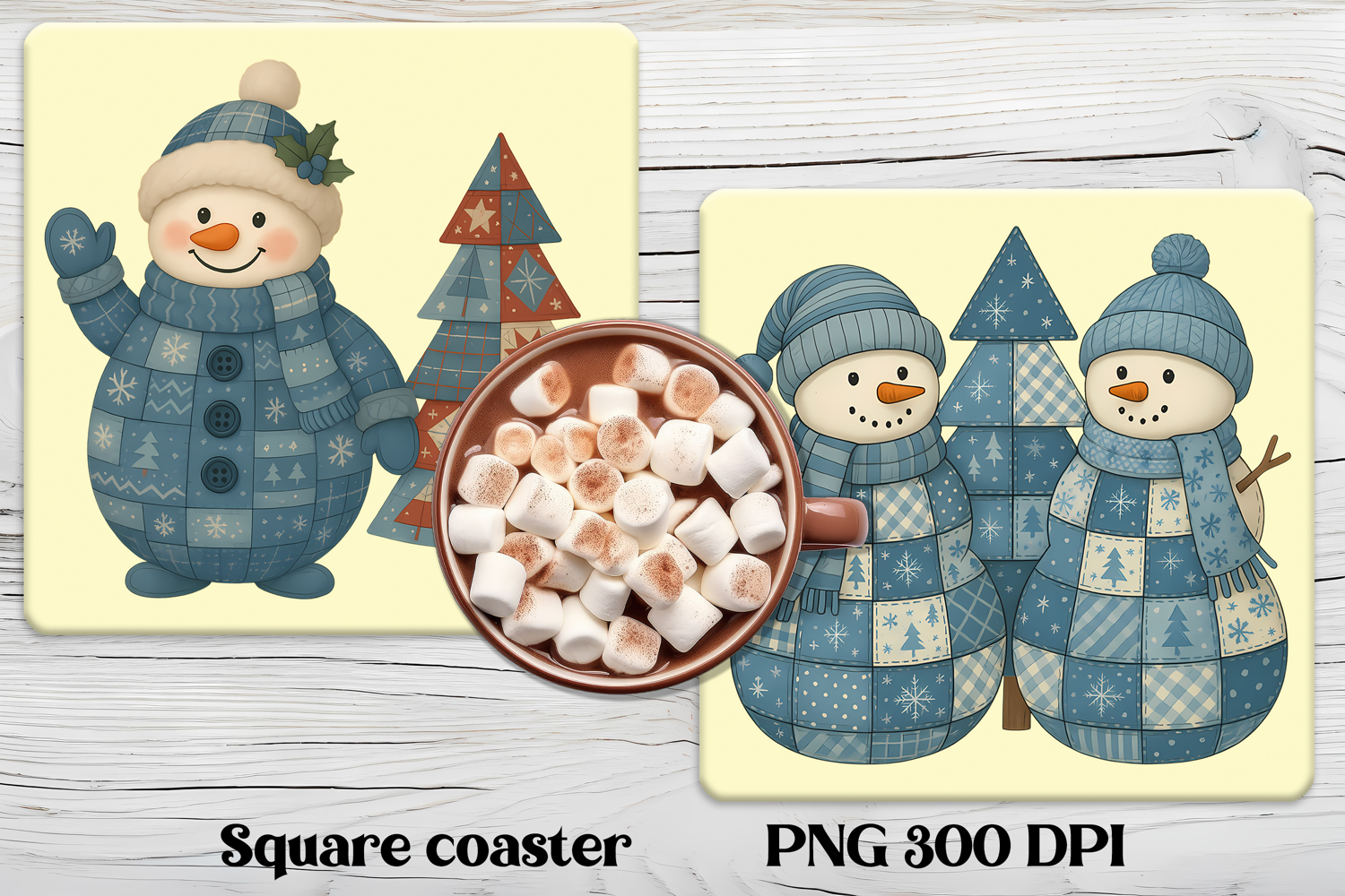 Cute Christmas patchwork snowman square coaster sublimation design, Christmas snowman sublimation design, Christmas snowman coaster.