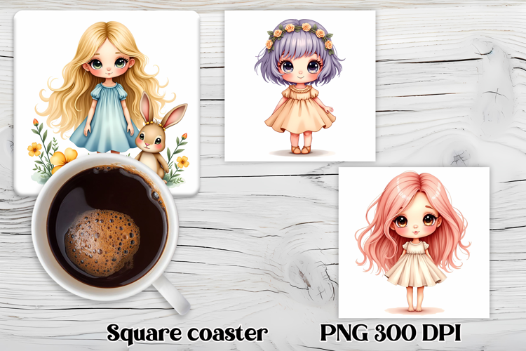 Cute doll flower square coaster sublimation design – girl floral coaster PNG, sweet doll sublimation design.
