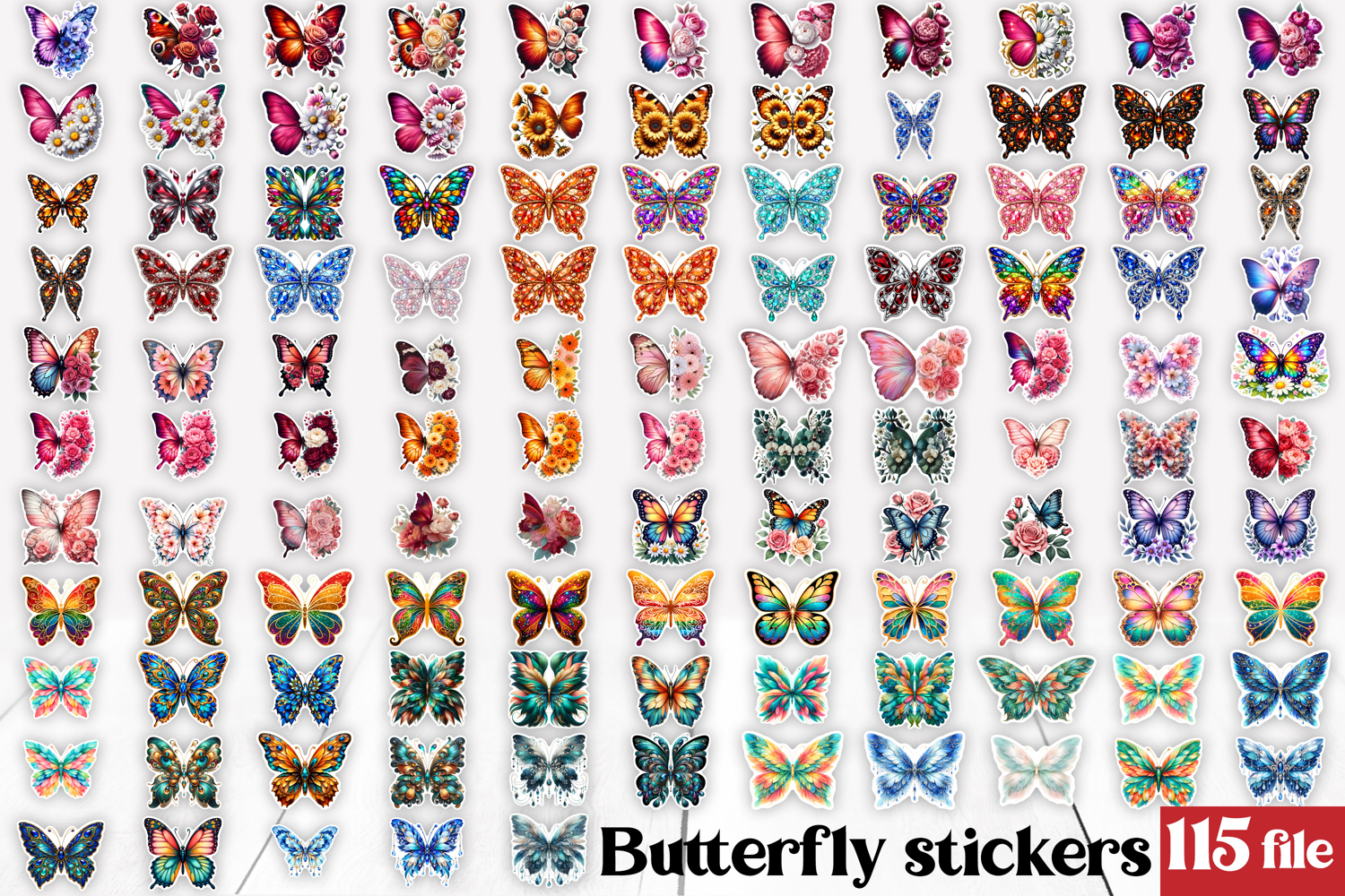 Butterfly flower stickers printable bundle, summer butterfly stickers printable PNG, tropical butterfly PNG design, printable summer sparkling butterfly stickers, flower butterfly clipart.