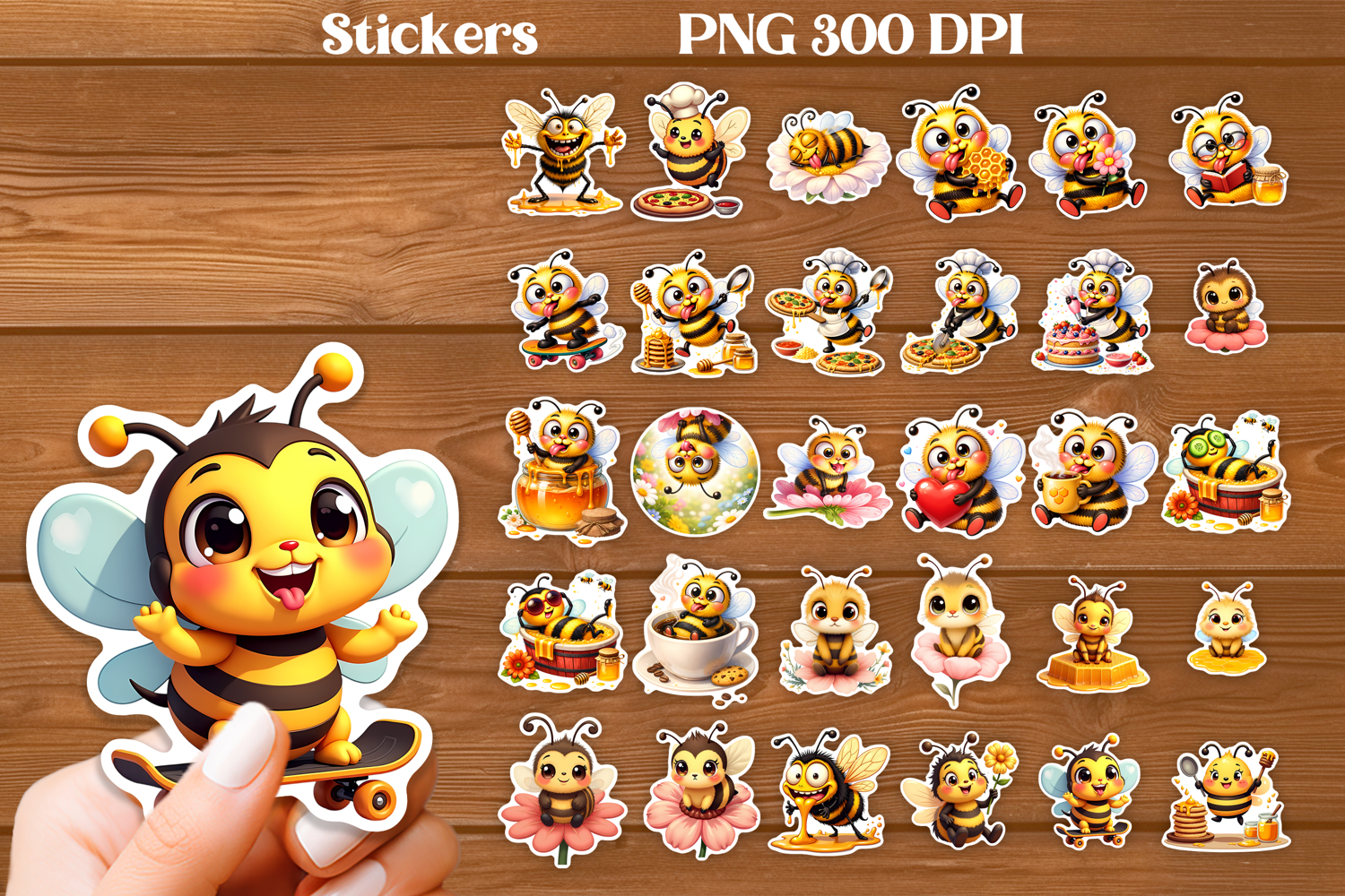 Cute bee stickers printable bundle, funny summer bee stickers PNG design, honey bee sticker pack.