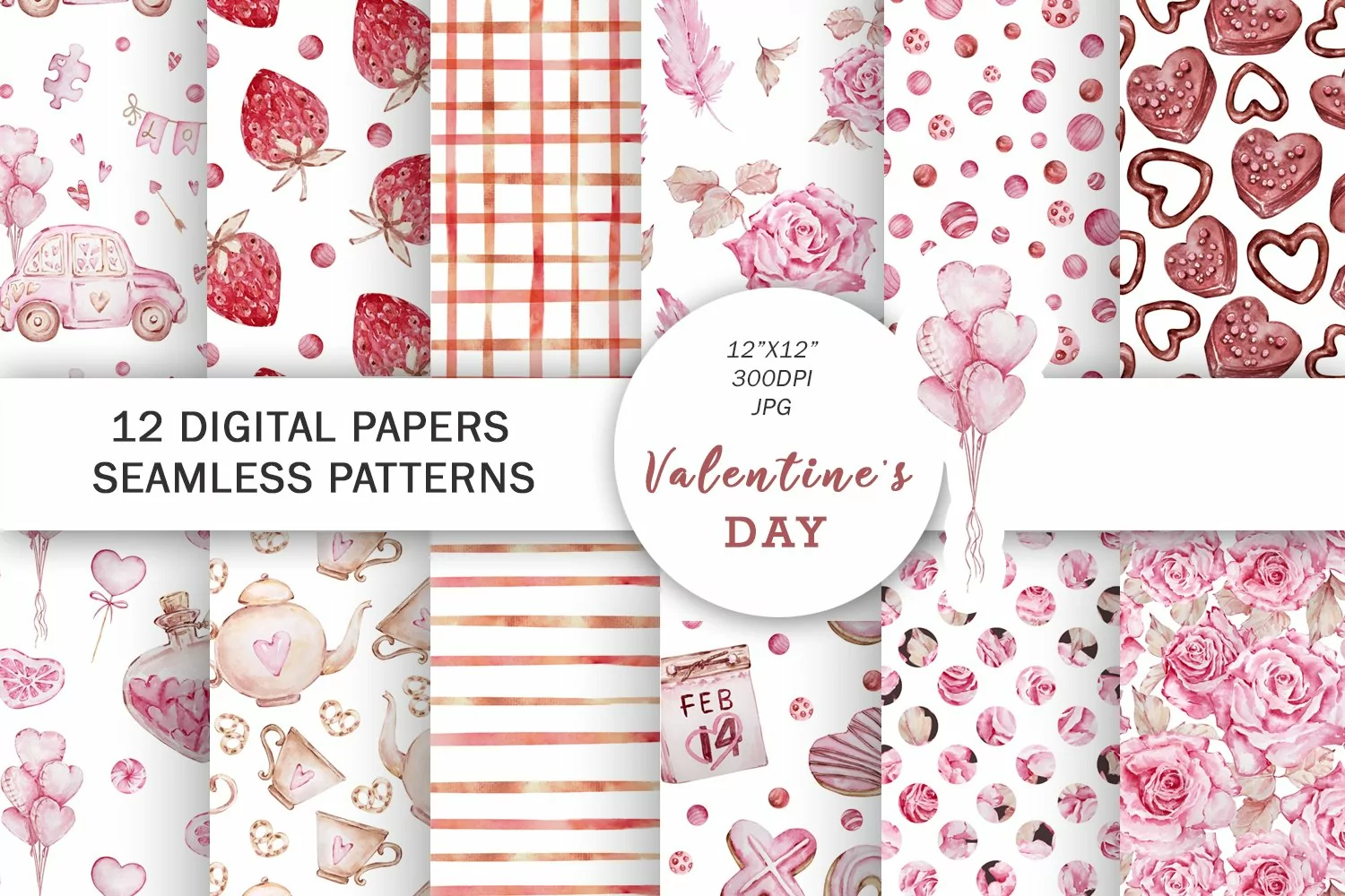 Watercolor Valentines Digital Papers, Valentines seamless pattern, Paper Crafts, Love paper, Roses paper.