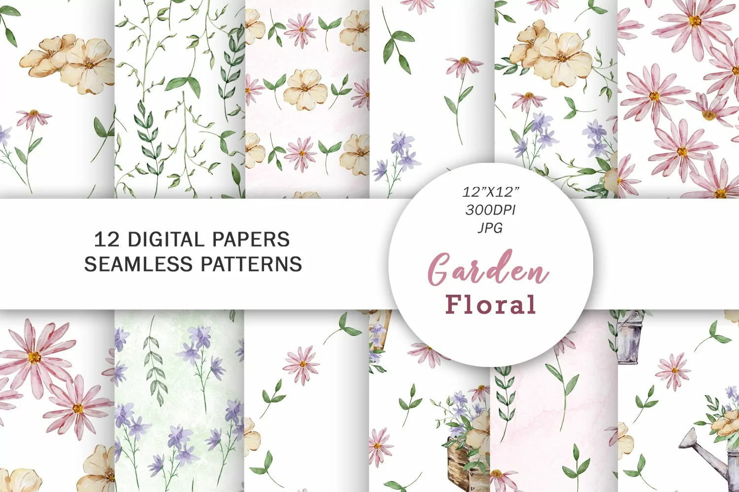 Watercolor Garden Floral Digital Paper Seamless Patterns.