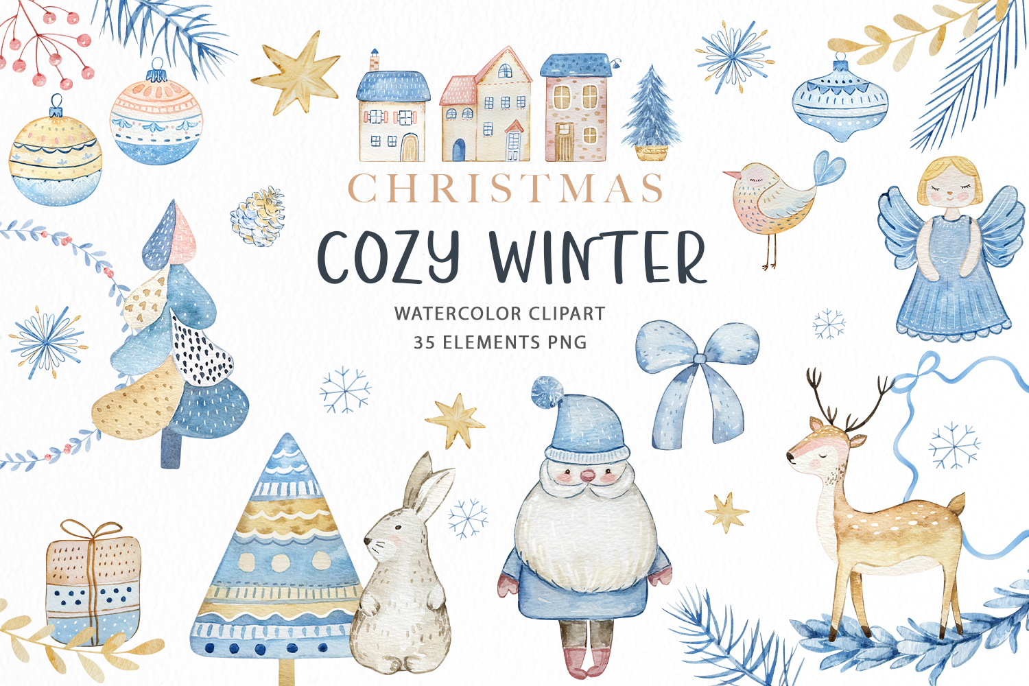 Watercolor Scandinavian Christmas clipart. Set of hand drawn Santa Claus, Christmas ornaments, Christmas tree, houses, cute animals and winter floral.
