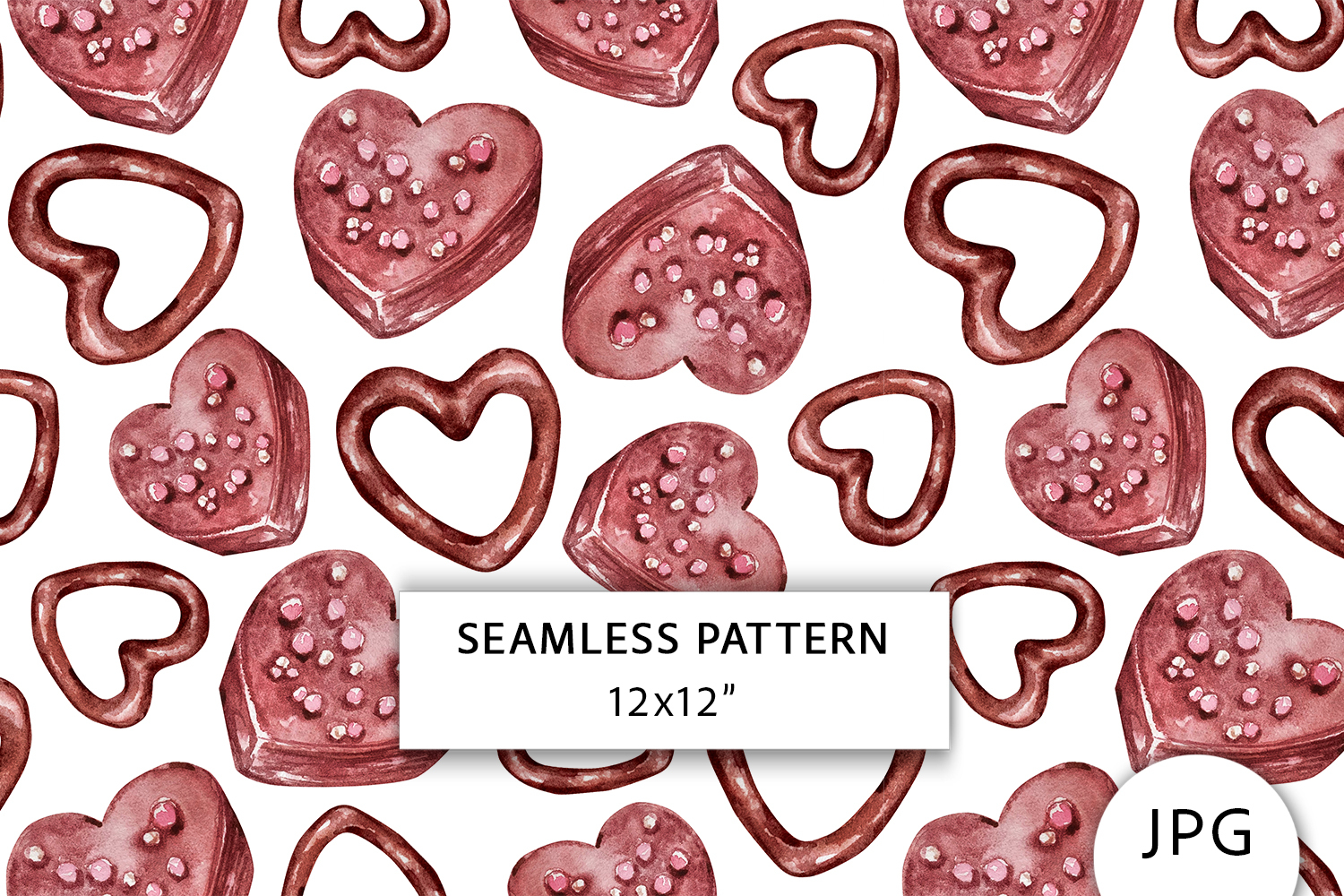 Watercolor Hearts Chocolate Digital Paper, Seamless Patterns, Valentines Day background.