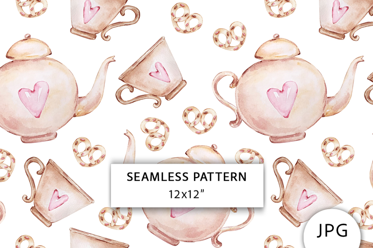 Watercolor Teapot with Hearts Sweets Digital Paper, Seamless Patterns, Valentines Day background.