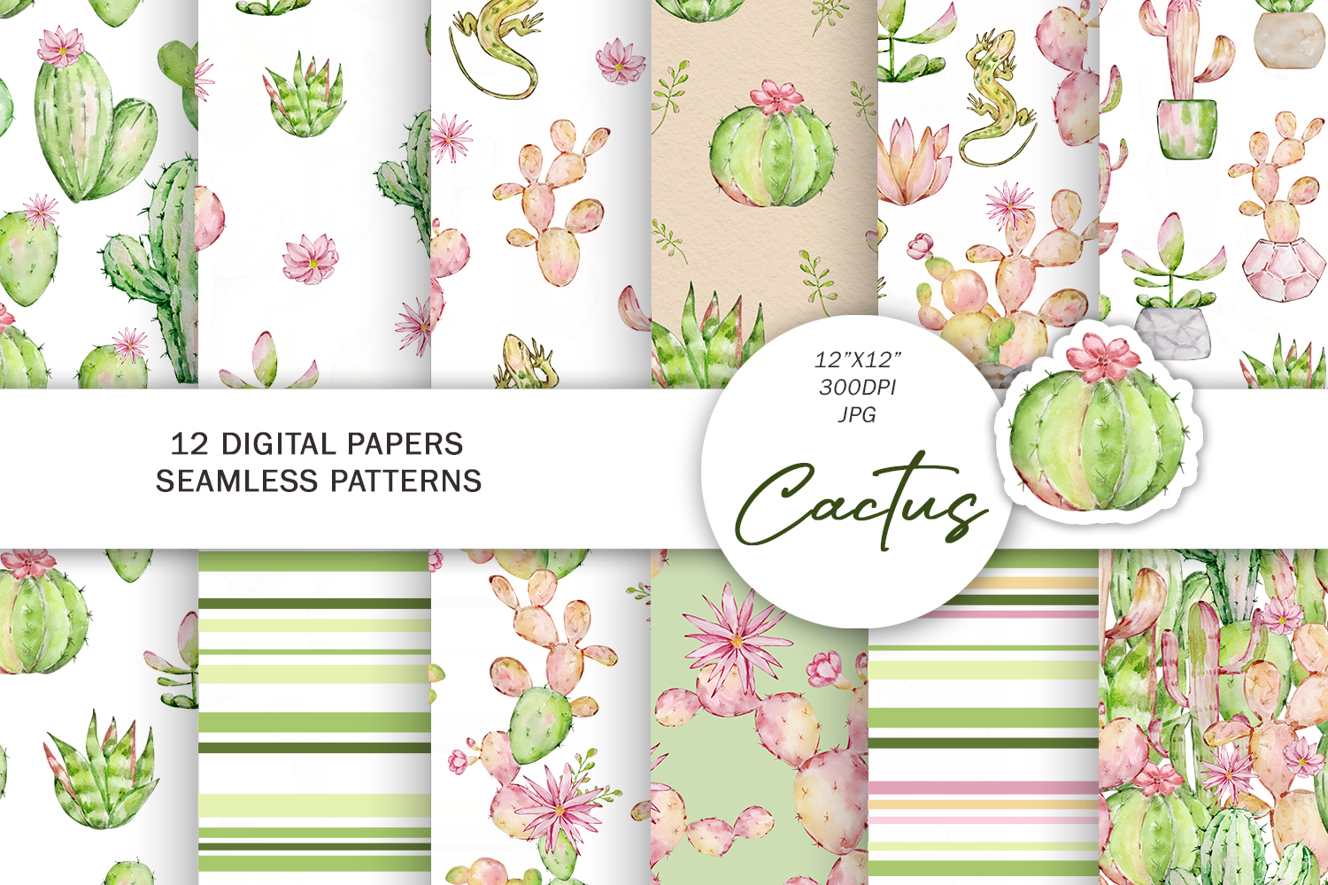 Succulent Digital Paper Watercolor Cactus Pattern Hand Painted Cactus Craft Background Digital Botanical Pattern Pack Seamless Cactus Background Digital Cactus Paper Watercolor Succulent Pattern Planner Background Cactus Green Plant Seamless Pattern