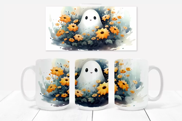 Halloween cute ghost flower sublimation mug design wrap 15 Oz, Halloween mug sublimation wrap, Halloween cute ghost flower illustration, Halloween cute ghost flower sublimation.