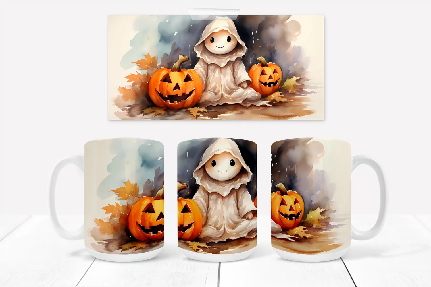Halloween cute ghost flower sublimation mug design wrap 15 Oz, Halloween mug sublimation wrap, Halloween cute ghost flower illustration, Halloween cute ghost flower sublimation.
