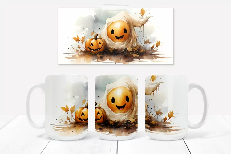 Halloween cute ghost flower sublimation mug design wrap 15 Oz, Halloween mug sublimation wrap, Halloween cute ghost flower illustration, Halloween cute ghost flower sublimation.