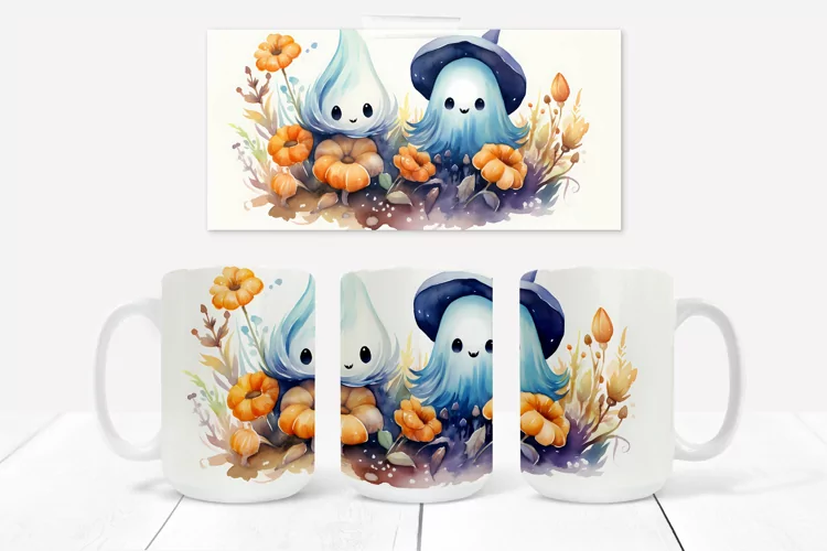 Halloween cute ghost flower sublimation mug design wrap 15 Oz, Halloween mug sublimation wrap, Halloween cute ghost flower illustration, Halloween cute ghost flower sublimation.