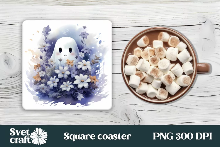 Halloween cute ghost flower square coaster sublimation design, Halloween ghost sublimation design, Halloween ghost coaster PNG.