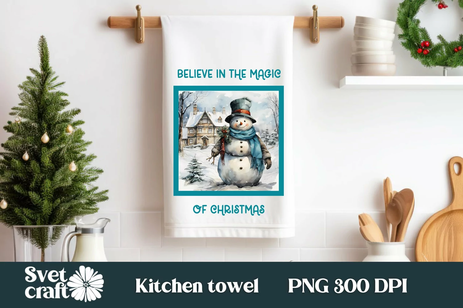 Christmas kitchen towel sublimation design, snowman kitchen towel clipart PNG, believe In the magic of Christmas.