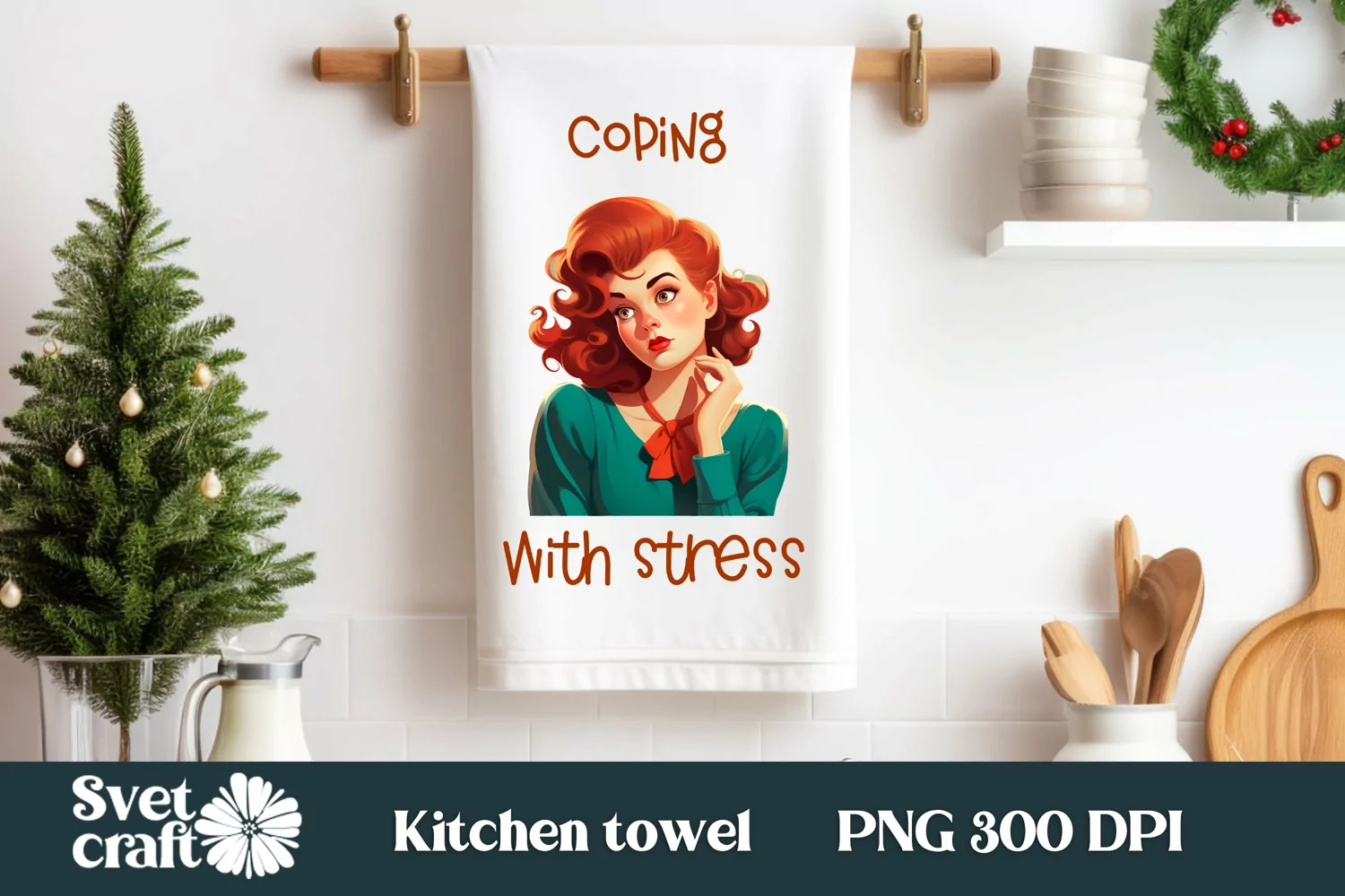 Pin up girl kitchen towel sublimation design, retro woman kitchen towel clipart PNG, coping with stress.