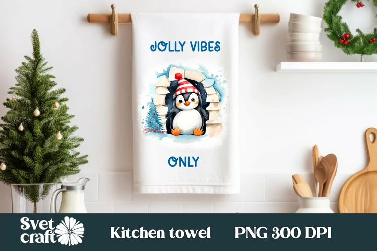 Christmas kitchen towel sublimation design, penguin kitchen towel clipart PNG, jolly vibes only.