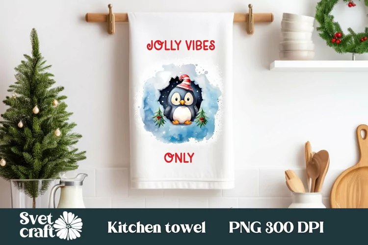 Christmas kitchen towel sublimation design, penguin kitchen towel clipart PNG, jolly vibes only.