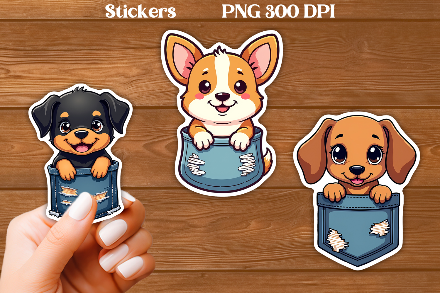 Funny dog in pocket sticker printable PNG design, puppy sticker pack, cute animal pocket stickers.