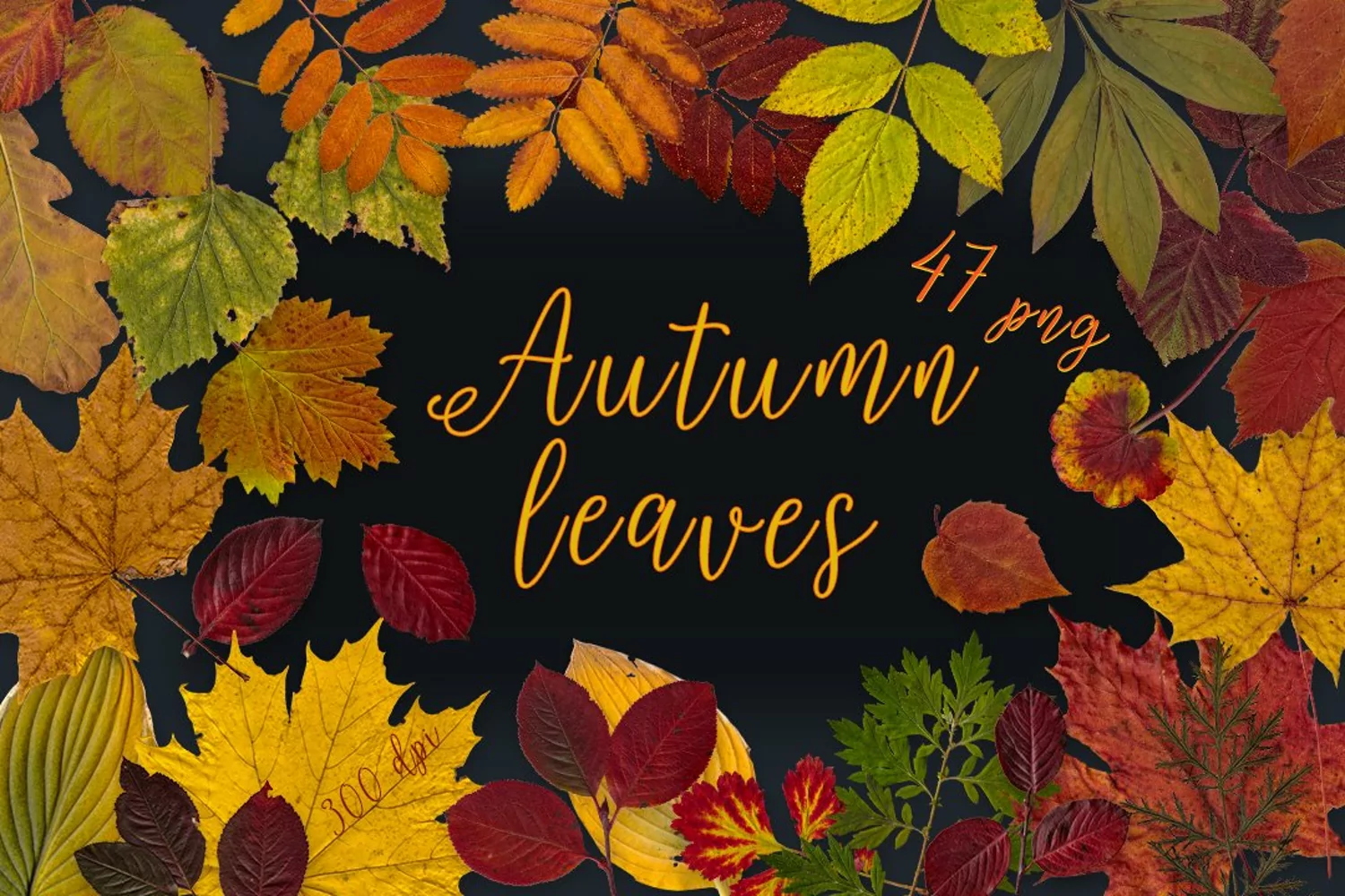 47 scanned and carefully cut autumn leaves in PNG format, with a resolution of 300 dpi.