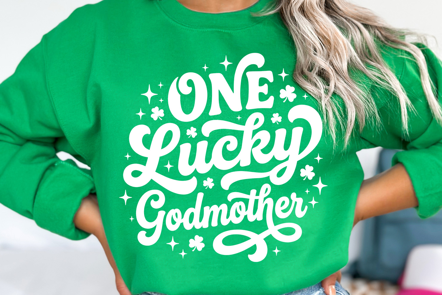 Celebrate St. Patrick’s Day in style with this One Lucky godmother design! Featuring bold script lettering with shamrocks and sparkle accents, this festive design is perfect for shirts, sweatshirts, and cozy holiday apparel.
