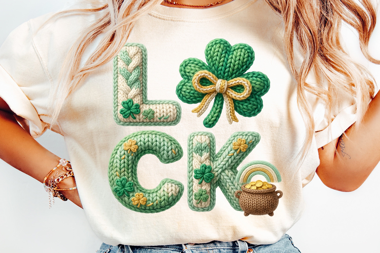 Create a cozy and festive St. Patrick’s Day shirt with this Luck Faux Knit PNG design featuring a chunky knit-style texture, shamrocks, a bow, and a pot of gold. This design is perfect for trendy holiday apparel and looks beautiful on light-colored shirts.