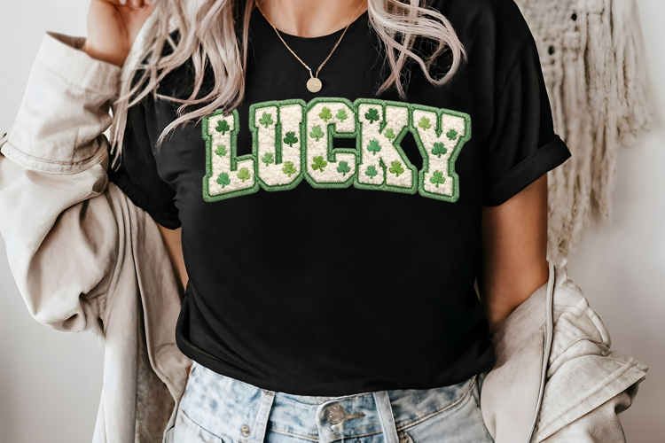 Create a trendy St. Patrick’s Day look with this Lucky Chenille Patch PNG design. Inspired by popular varsity and embroidered sweatshirt styles, this design features bold “Lucky” lettering with a faux chenille texture and shamrock accents.