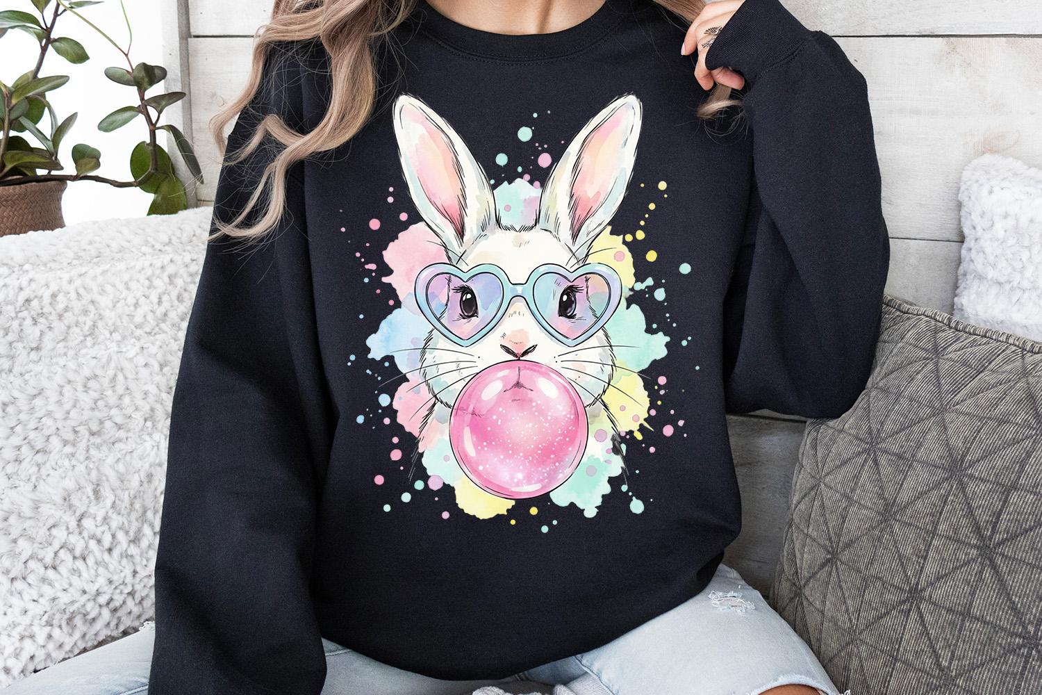 Add a playful pop of personality to your Easter projects with this bubble gum Easter bunny png design. Featuring a cute bunny blowing pink bubble gum and wearing heart-shaped glasses, this design is perfect for fun Easter shirts, trendy spring apparel, and sublimation projects.