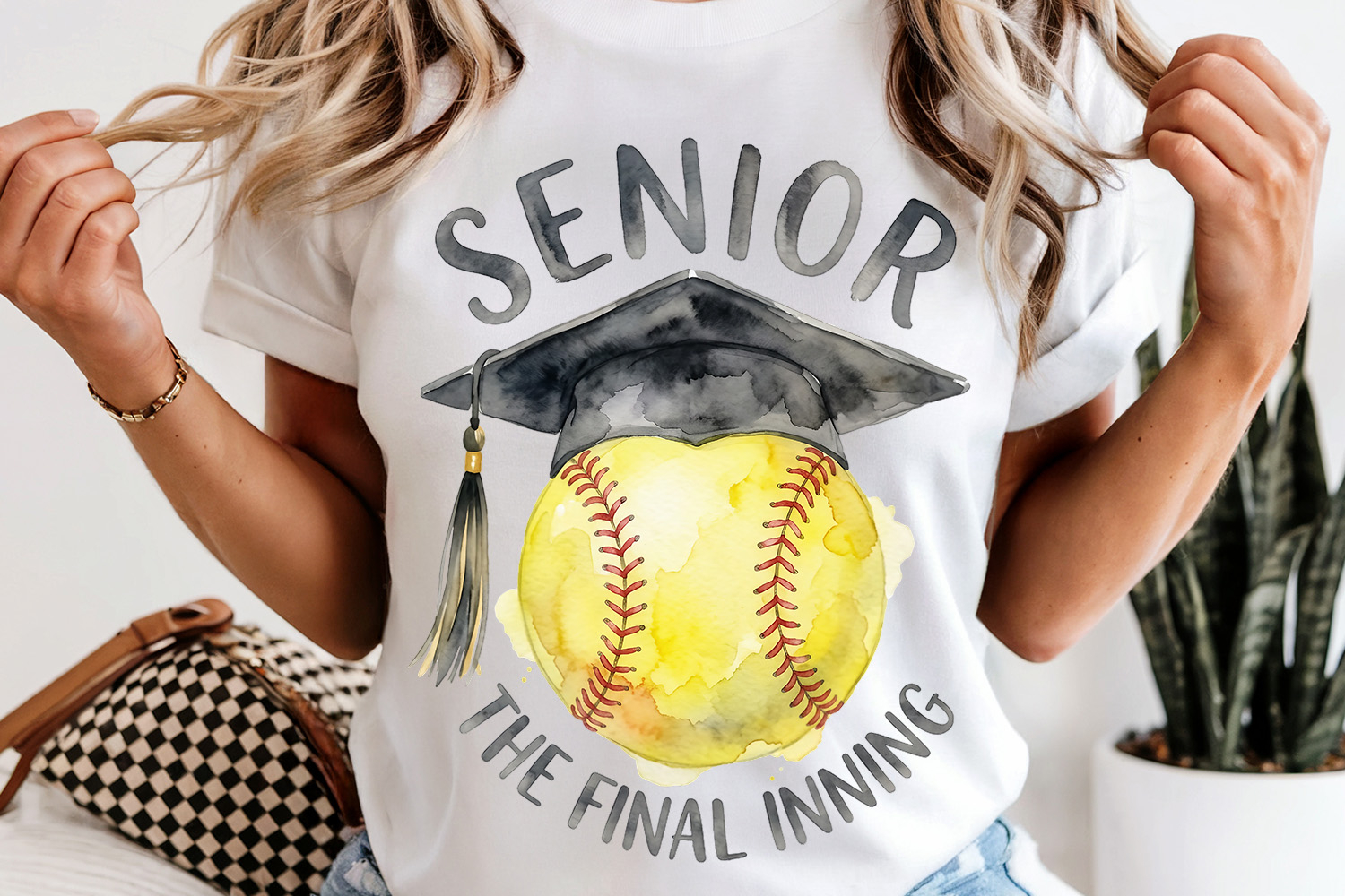 This sporty graduation design features a watercolor softball with a graduation cap and the phrase “Senior – The Final Inning.” Perfect for celebrating senior softball players finishing their final season.