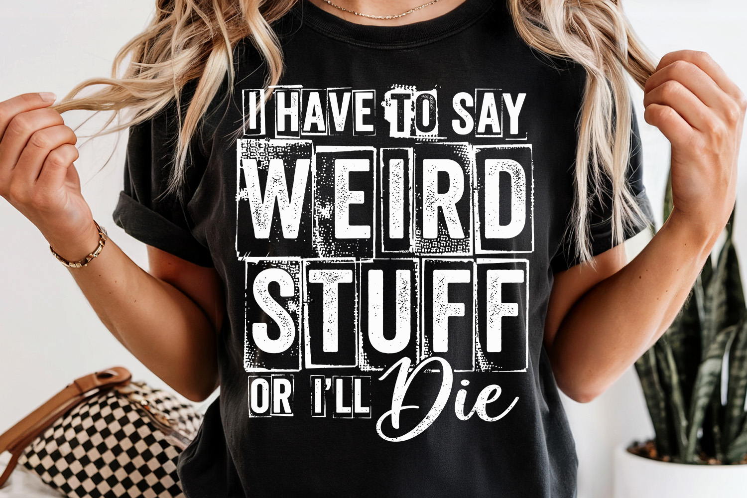 This bold and humorous design features the phrase “I Have to Say Weird Stuff or I’ll Die” in a distressed block-style layout with a script accent. Perfect for creating funny, eye-catching shirts with personality.