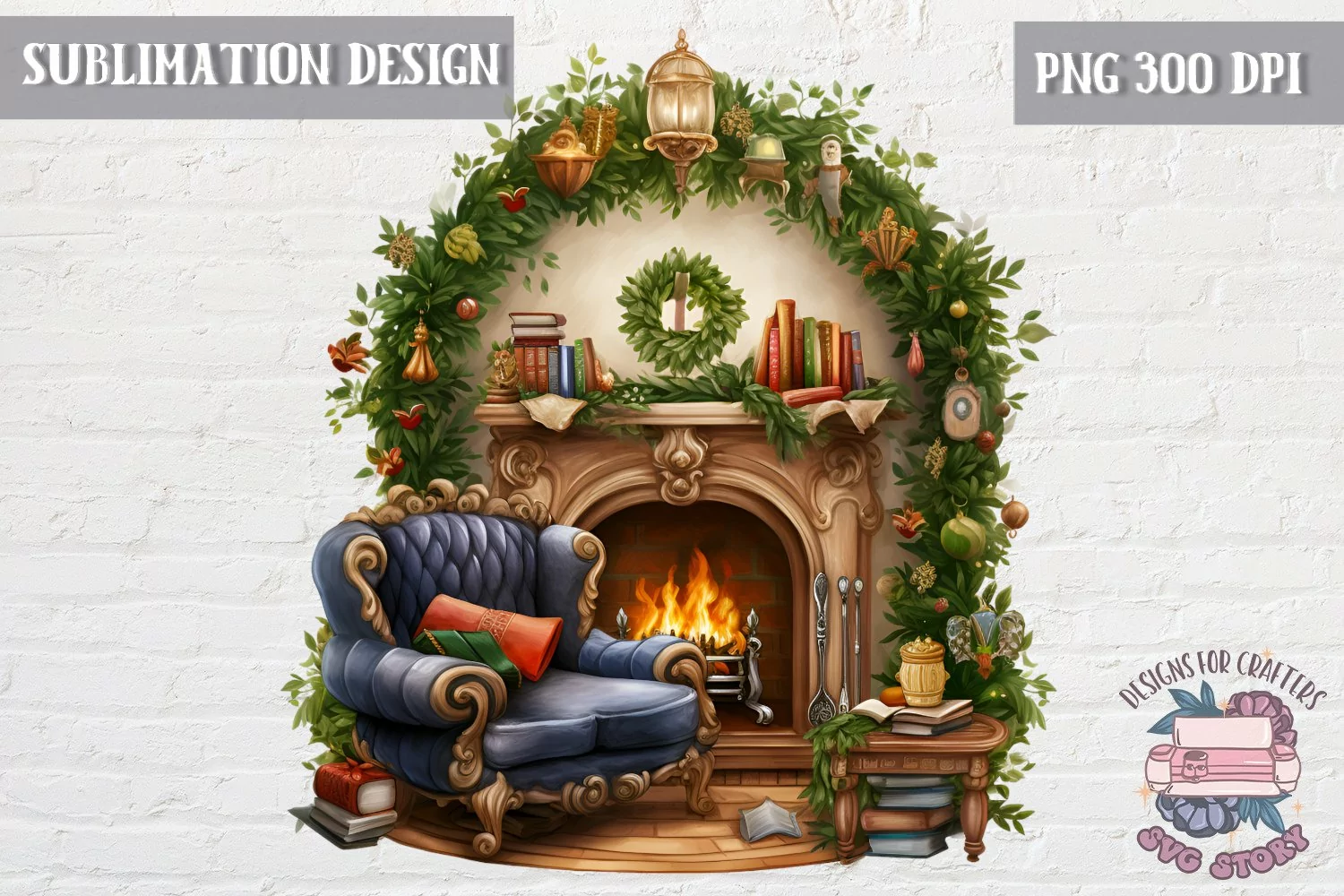 Christmas cozy house fireplace Decorated Tree Sublimation