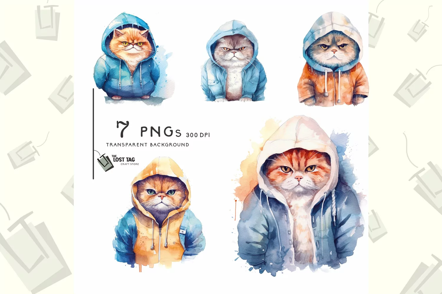 watercolor grumpy fat cat in hood clipart bundle sublimation example image 1
