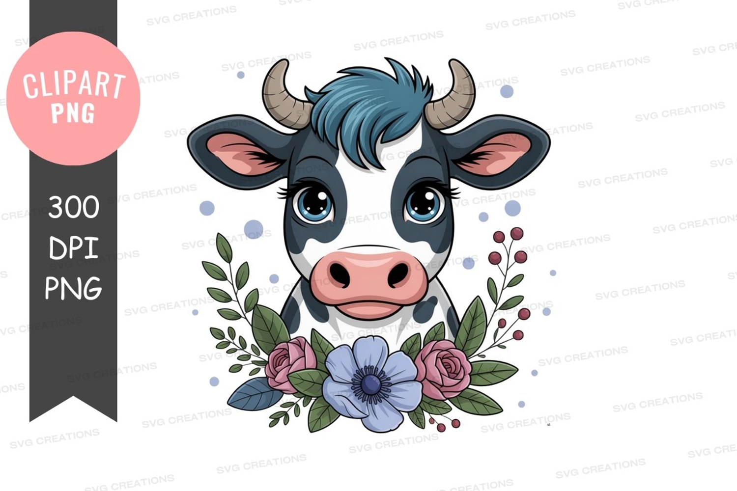 Cute cow with blue hair and flowers animal cartoon example image 1