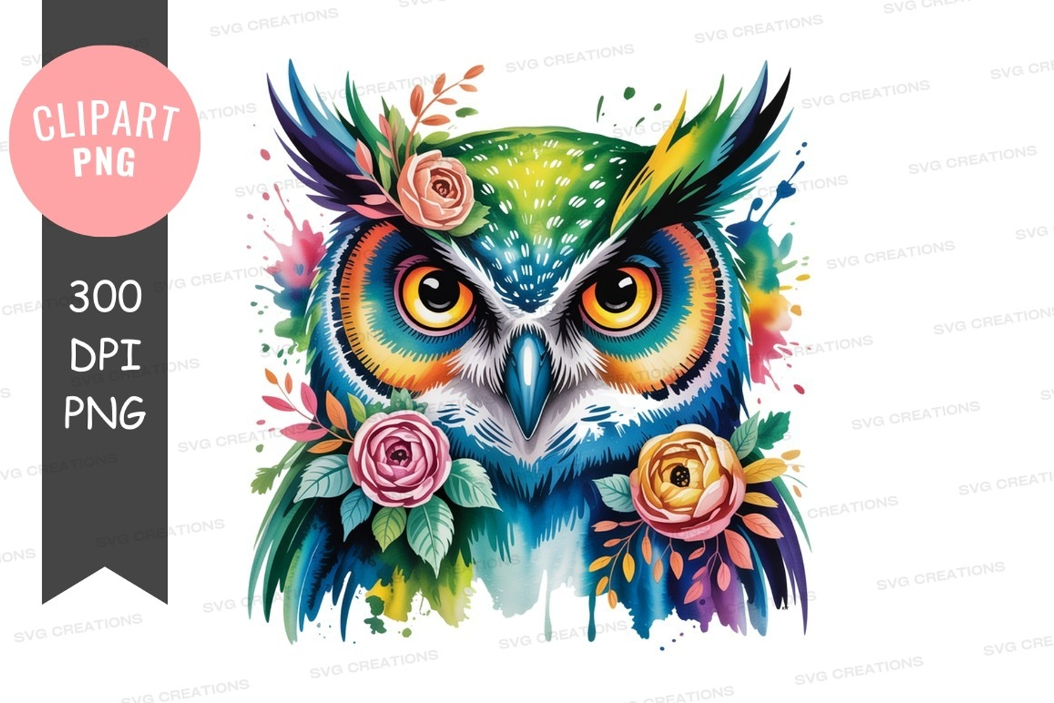 Similar Design Products to Colorful owl adorned with flowers feathers eyes