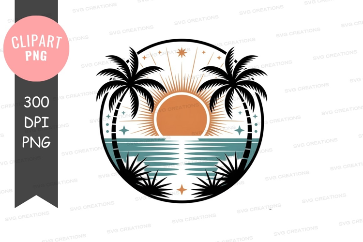 Vintage Retro Illustration Ocean Beach Sunrise Sunset Boho Tropical Palm Trees
