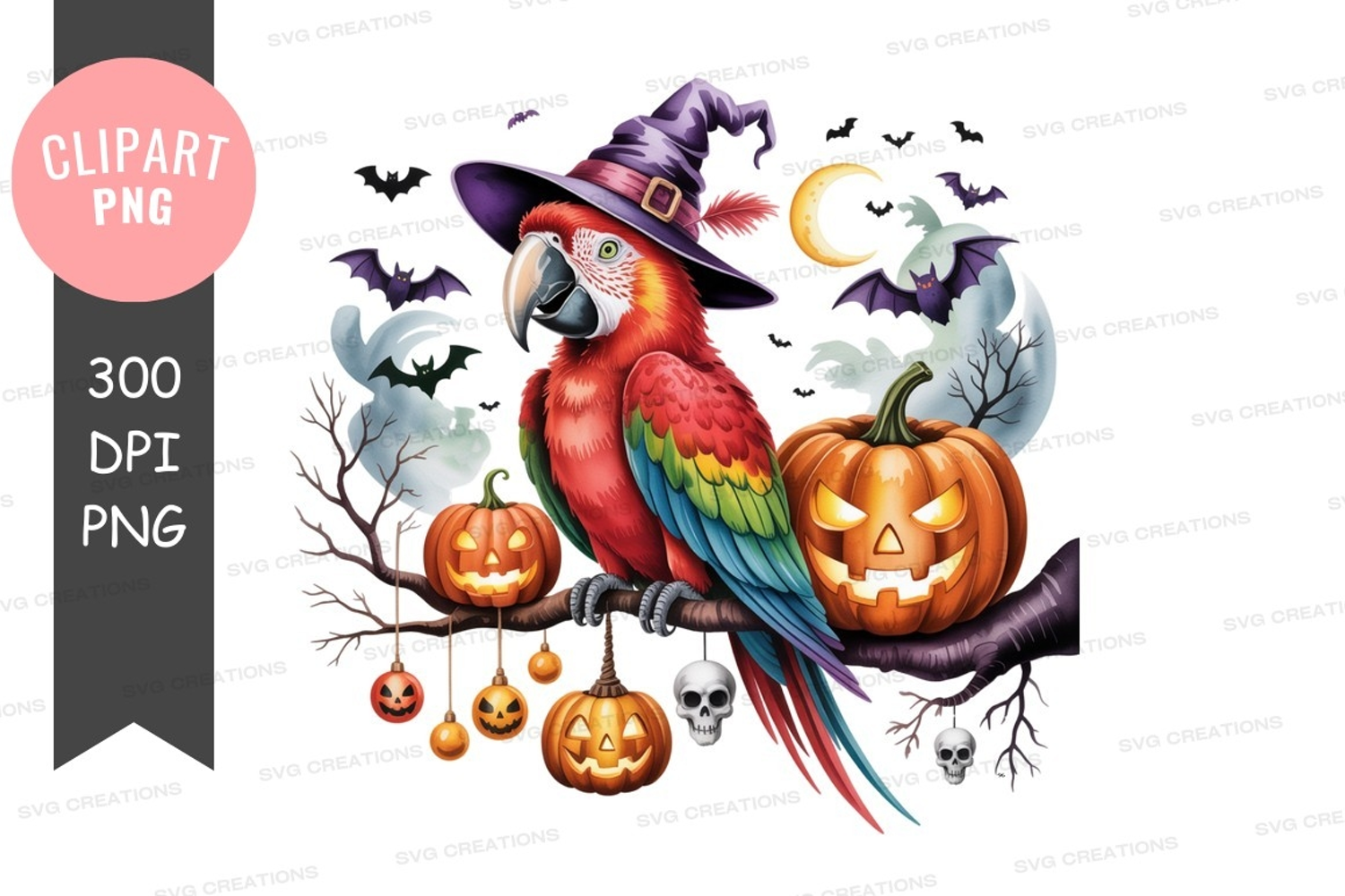 Halloween parrot witch clipart with pumpkins and bats example image 1
