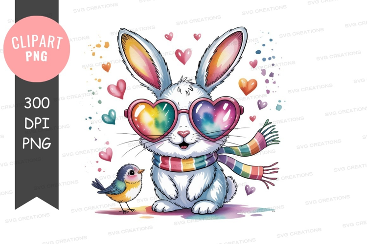 Cute rabbit clipart with rainbow heart glasses and scarf example image 1