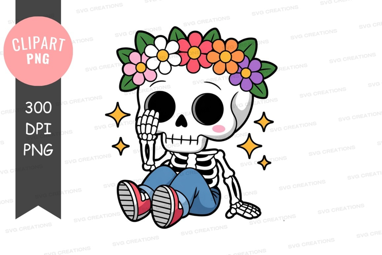 Cute cartoon skeleton sitting with flower crown example image 1