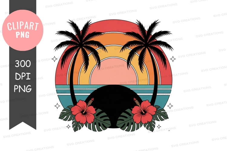 Palm Trees Vacation Clipart Hibiscus Flowers Vintage Art Tropical Illustration Summer Vibe Beach Scene Retro Sunset Pride Symbol Ocean Sunset