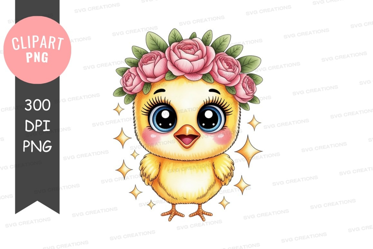 Illustration Cartoon Whimsical Cute Clipart Green Leaves Chick Pink Roses Sparkling Stars Floral Crown