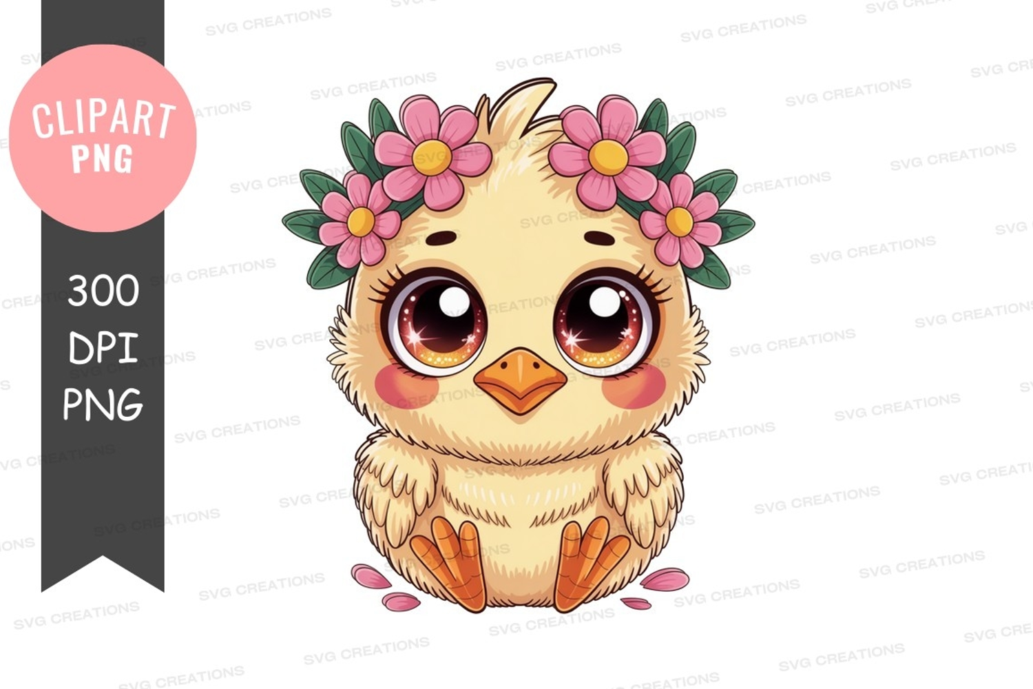 Cartoon Cute Pink Flowers Crown Yellow Eyes Fluffy Chick