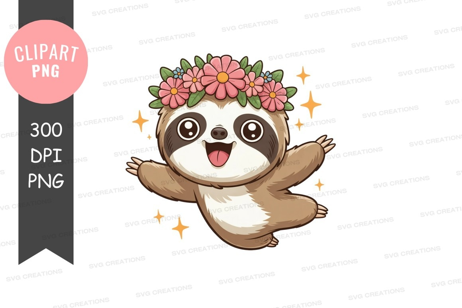 Happy sloth with flower crown clipart png example image 1