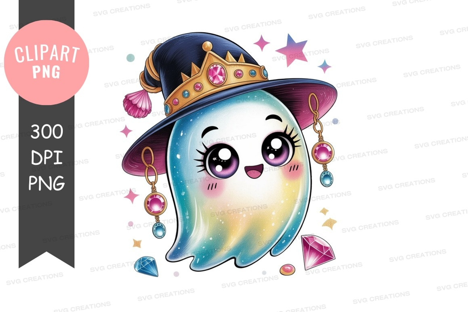Whimsical Friendly Witch Crown Ghost Hat Stars Magical Jewels Gemstones