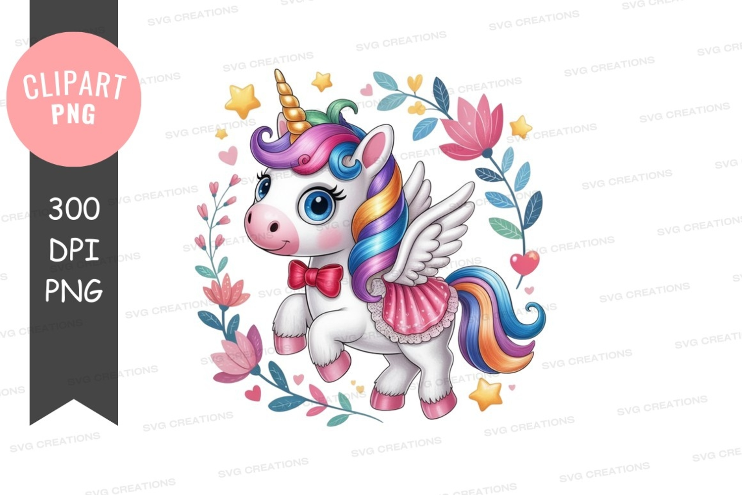 Illustration Fantasy Flowers Clipart Unicorn Rainbow Wings Stars Skirt Bowtie