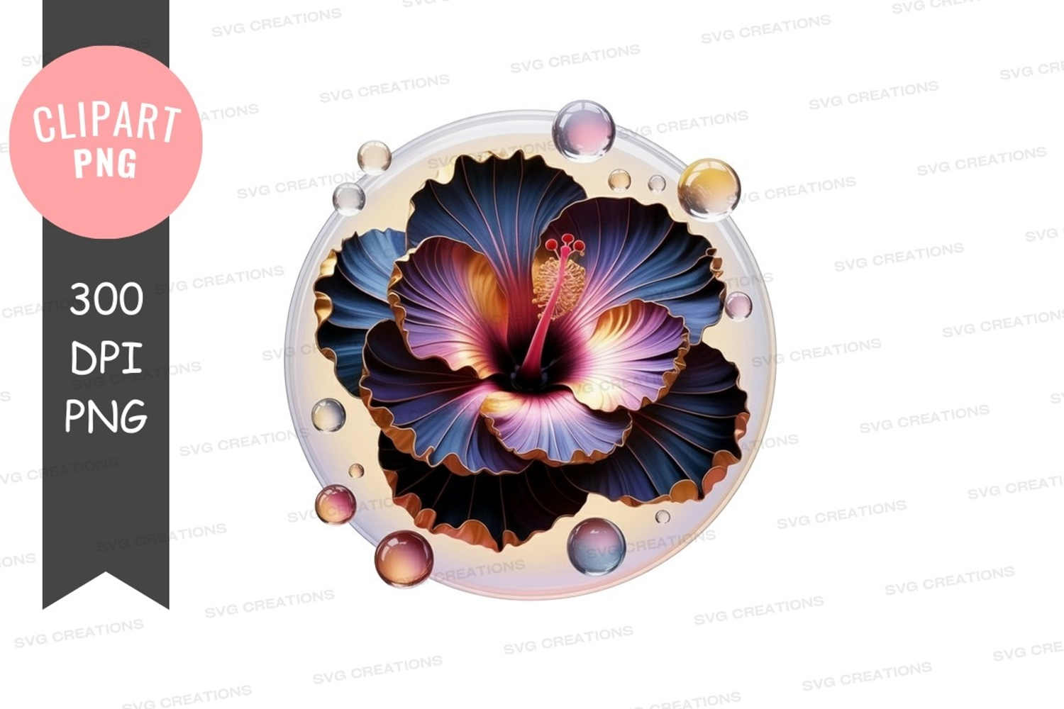 Flower Clipart Hibiscus Vibrant Png Digital Art Relaxed Stamen Circular Frame Water Droplets
