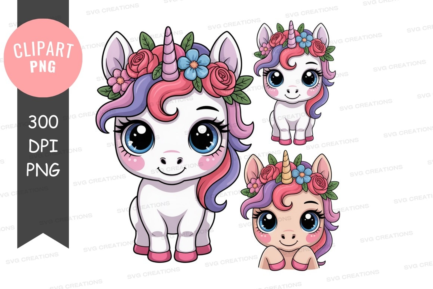 Illustration Cute Clipart Png Unicorn Magical Crescent Large Eyes Flower Crown Colorful Mane