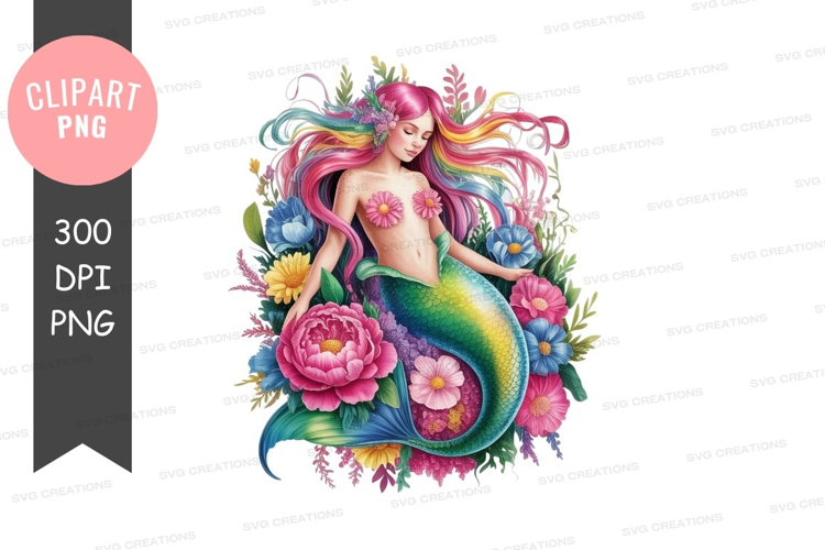 A Vibrant Illustration Of A Mermaid With Rainbow-c Surrounded By A Variety Of Colorful Flowers The M Flowing Hair Adorned With Floral Patterns And Is Dreamy Pose