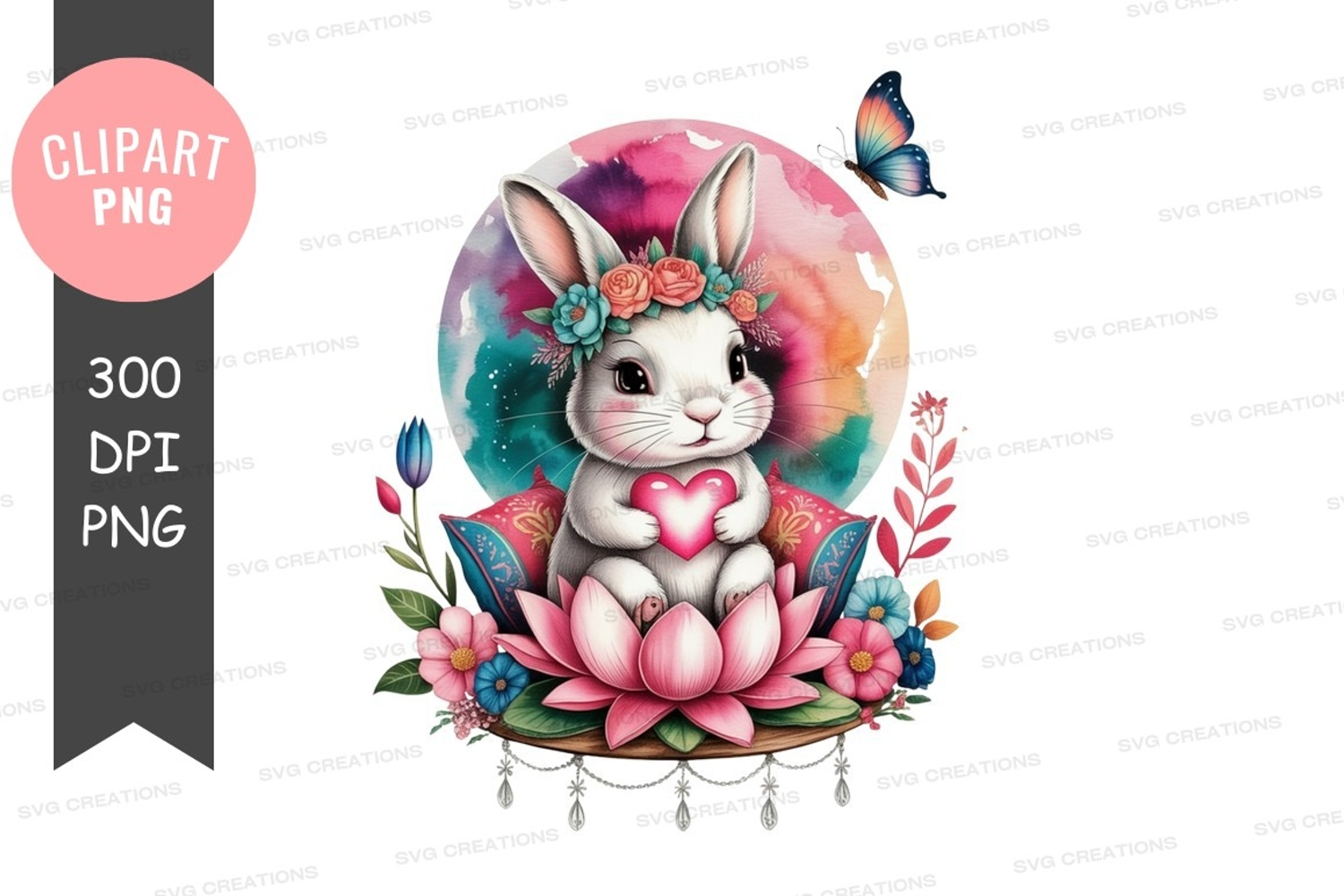 Set Against A Vibrant Watercolor Background A Whimsical Illustration Of A White Bunny Holding Adorned With A Floral Crown Surrounded By Colorful Flowers And A Butterfly