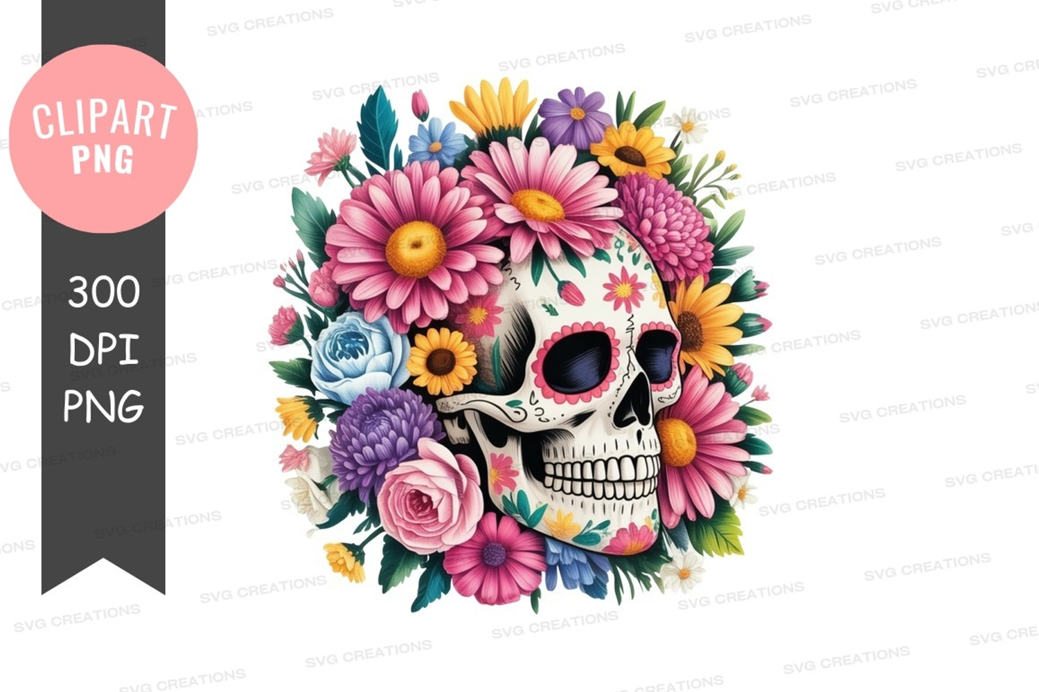 Similar Design Products to Colorful sugar skull with flowers clipart png
