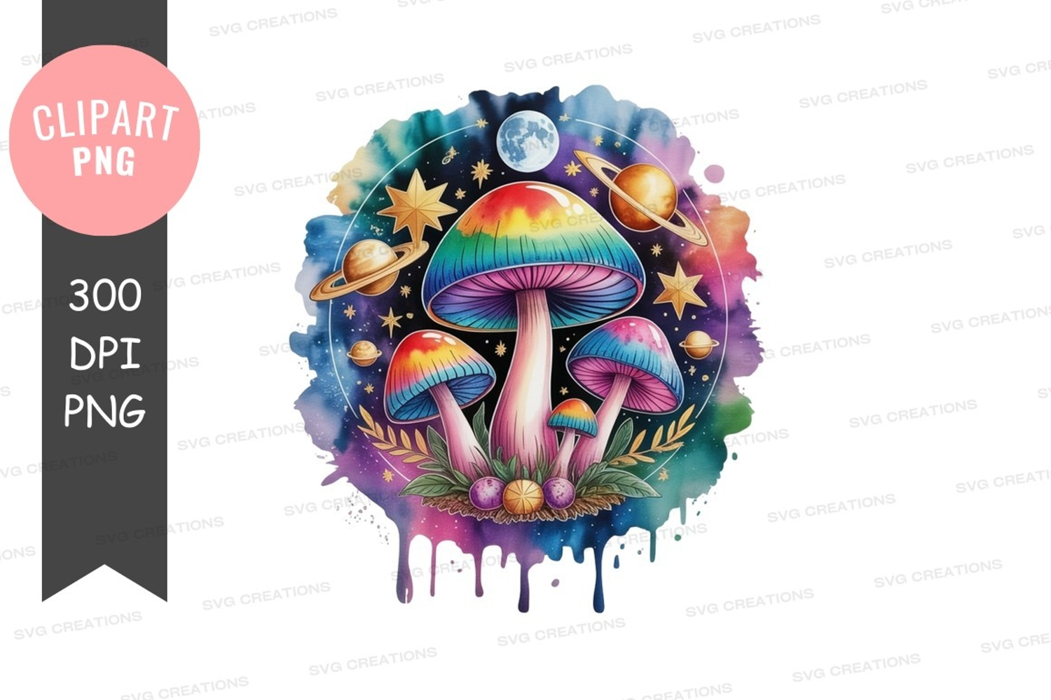 Stars A Vibrant And Colorful Illustration Featuring A Cl And A Crescent Moon The Design Is Framed Within A Watercolor-like Border With Splashes Of Color